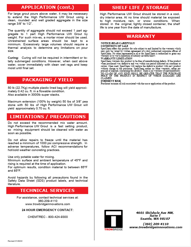 Trowbridge High Performance UnderWater Grout Data: